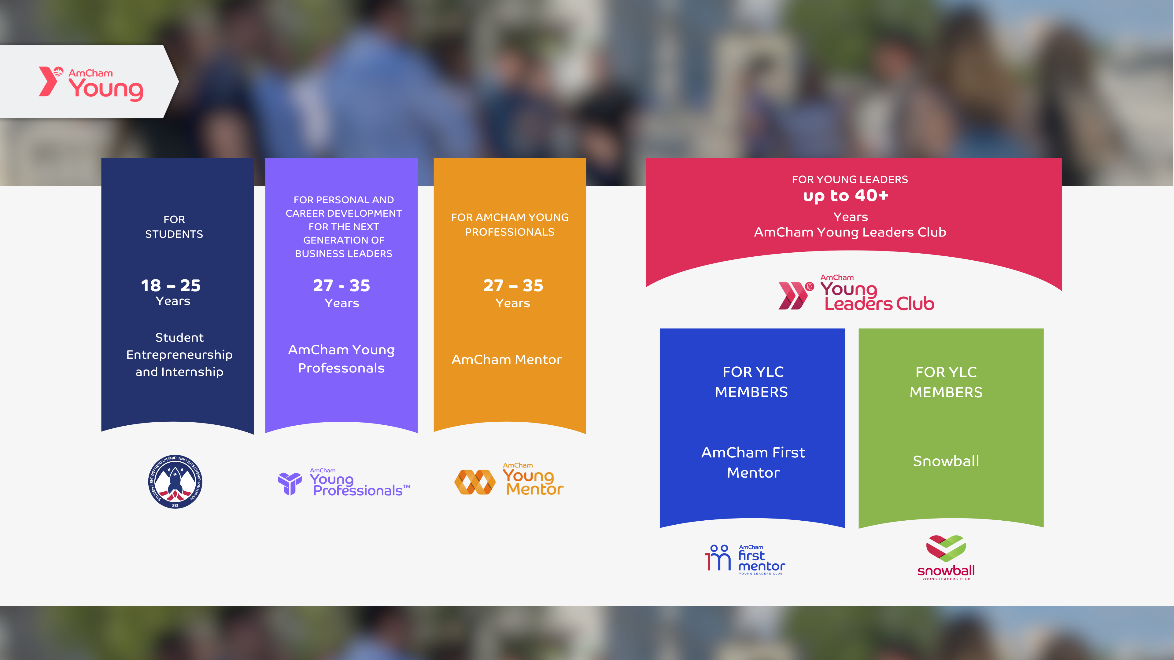 The AmCham YOUng Platform represents a forward-looking way of thinking. Its programs guide the personal and career development of up-and-coming business leaders. Ranging from student internships through the AmCham Young ProfessionalsTM program to the AmCham Young Leaders Club, First Mentor program and the Snowball (a think tank of outstanding young people), the YOUng platform connects young and active individuals who stand out from the crowd.